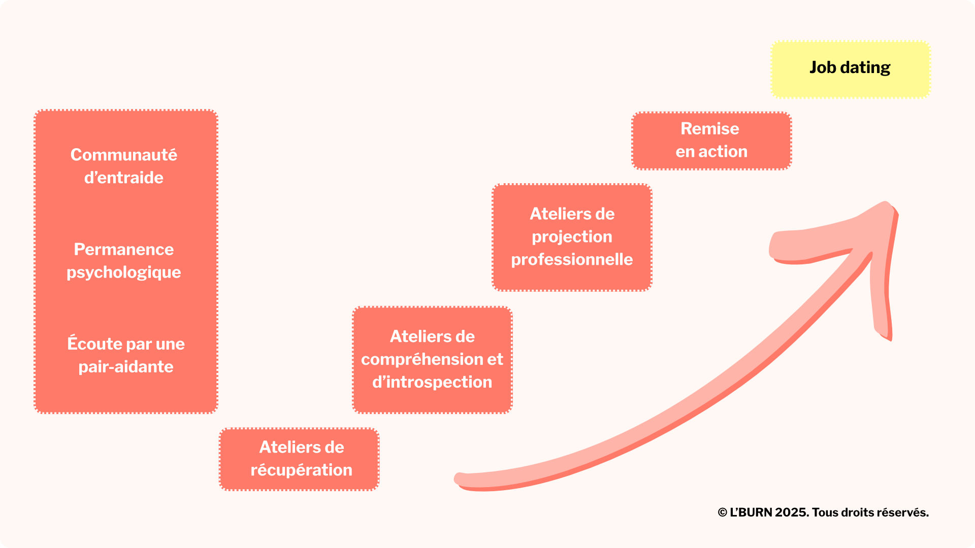 L’BURN accompagne les femmes qui traversent un burn-out grâce à un parcours bienveillant, progressif et pluridisciplinaire, basé sur la pair-aidance.